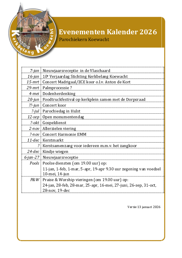 De ‘Stichting Kerkbelang Koewacht’ presenteert samen met de lokale kerkwerkgroepen weer een gevarieerd evenementen programma voor 2026.