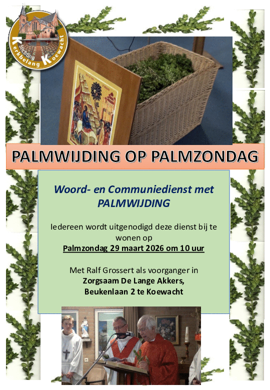 Op palmzondag, 29 maart 2026, wordt in Zorgsaam De Lange Akkers in Koewacht een woord- en communiedienst gehouden met Palmwijding. De voorganger is Ralf Grossert. Door omstandigheden is er geen processie en blijven we in de Lange Akkers. Pater Cyril Swinne (oorspronkelijk uit Sint Jansteen) kan vanwege gezondheidsproblemen niet naar Nederland komen.